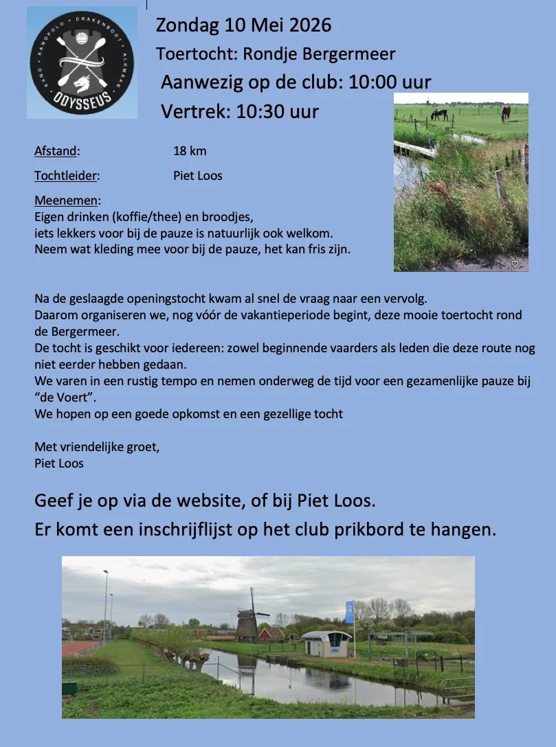 Op zondag 10 mei 2026 organiseren we de toertocht Rondje Bergermeer, een mooie tocht van ongeveer 18 kilometer. Na de geslaagde openingstocht kwam al snel de vraag naar een vervolg, en daarom plannen we deze gezellige vaartocht nog vóór de vakantieperiode begint.