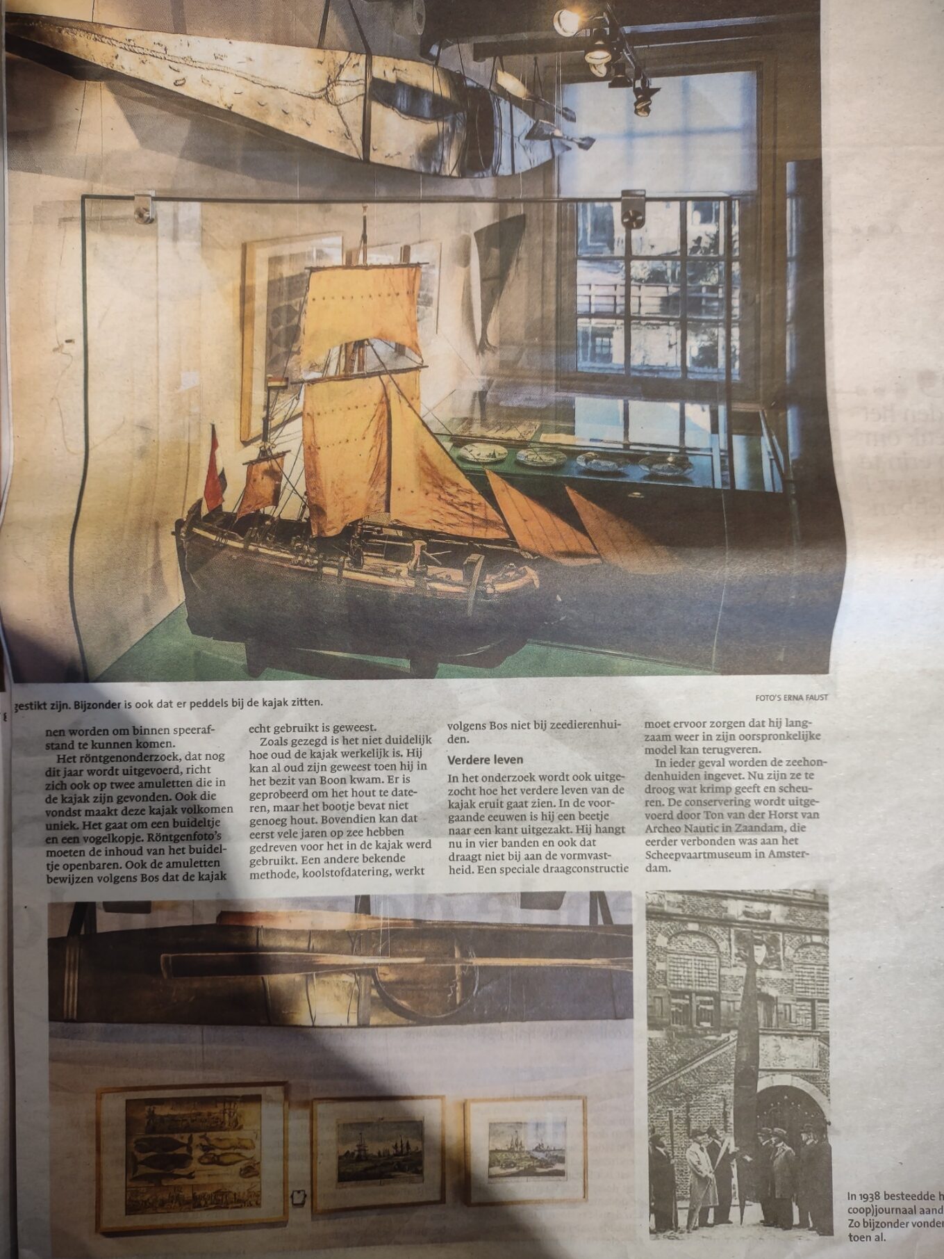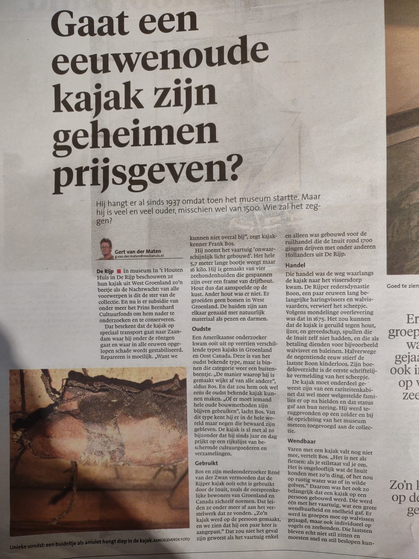 Dan een artikel over een historische Groenlandse kajak in museum In ’t Houten Huis in De Rijp. Aan deze kajak wordt onderzoek gedaan, o.a. met behulp van röntgenfoto’s. Eskimo’s (Inuit) waren zeer vaardig en wendbaar in deze kajaks.